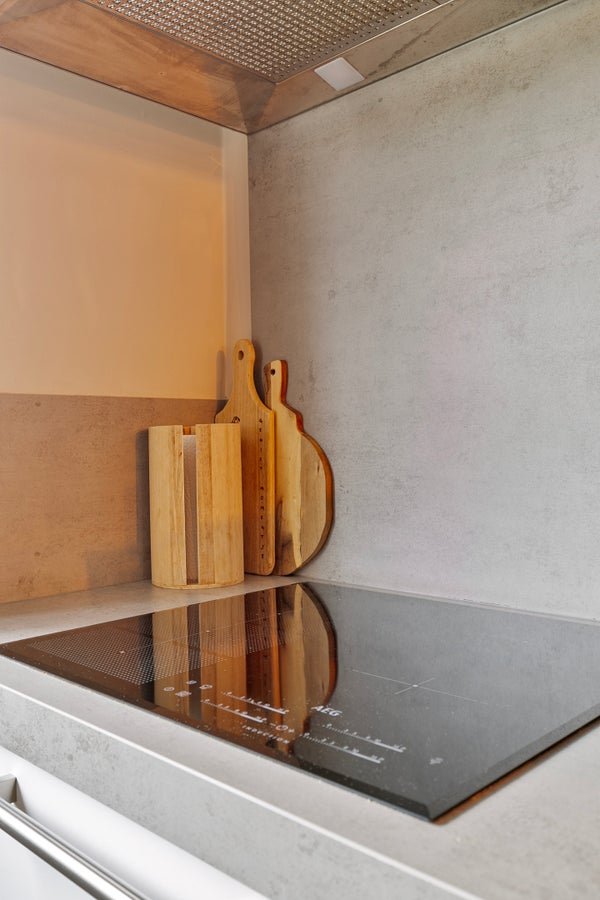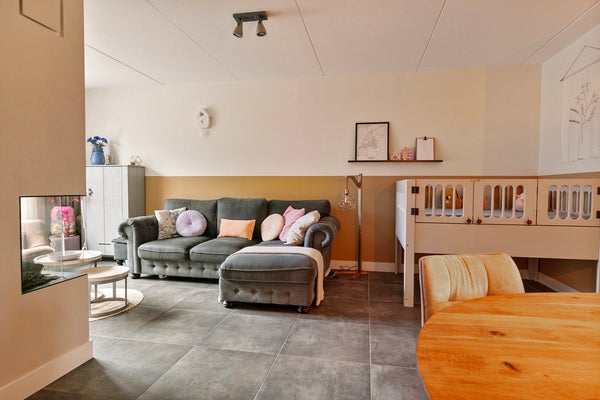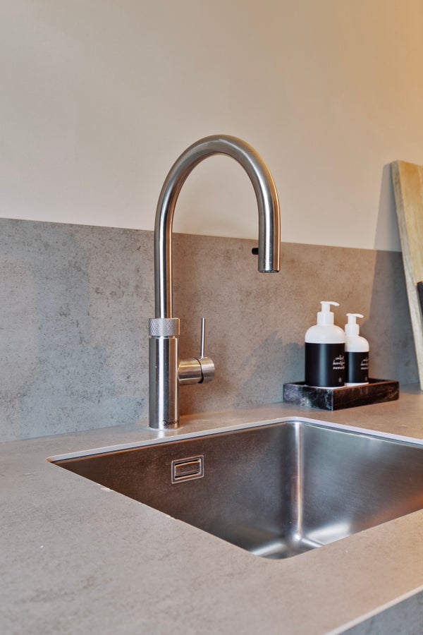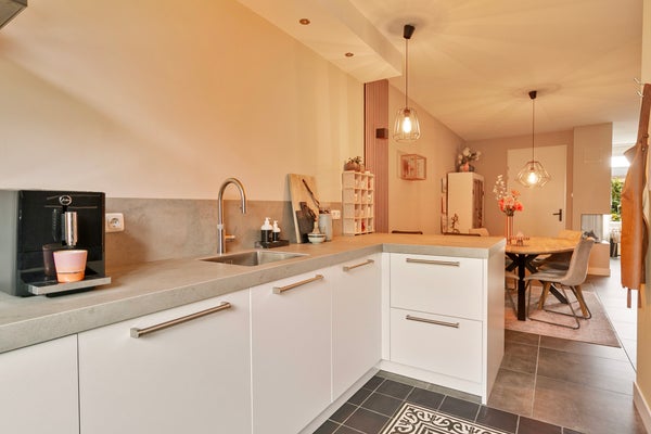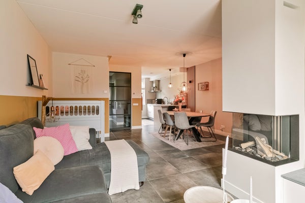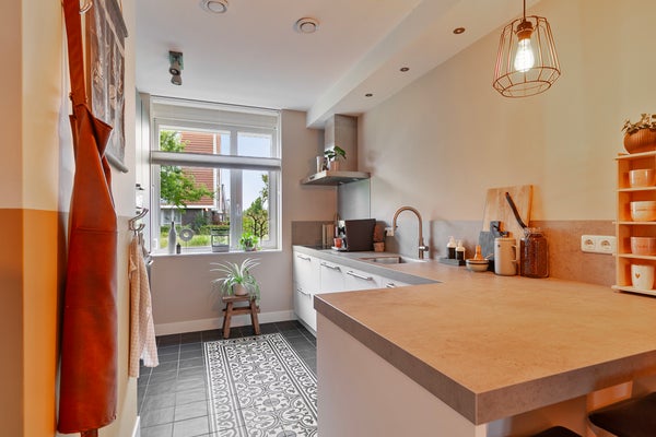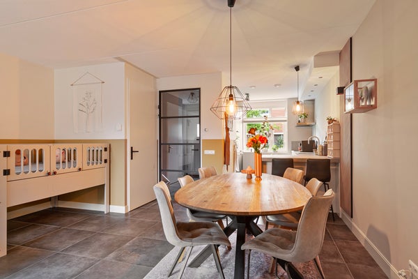 In de woonkamer met open keuken zie je een mooie verdeling tussen het zit- en het eetgedeelte. Het zitgedeelte bevindt zich aan de achterzijde, bij de gashaard met tv-meubel, en het eetgedeelte grenst aan de keuken. De kastenwand bij het portaal naar de tuin biedt, net als de trapkast, veel praktische bergruimte. Vanaf de eettafel is het een paar stappen naar de keuken, met een mooie tegelvloer en een zeer ruime opstelling met zitgelegenheid aan de woonkamerzijde. Het dikke betonlook blad met achterwand geeft de keuken een stoere uitstraling. Alle benodigde apparatuur is ingebouwd: een inductie kookplaat, afzuigkap, vaatwasser, combi-oven, koel-/vriescombinatie en een Quooker met close-in boiler.