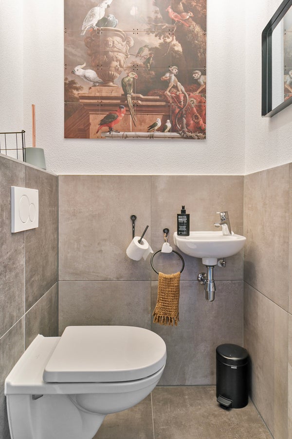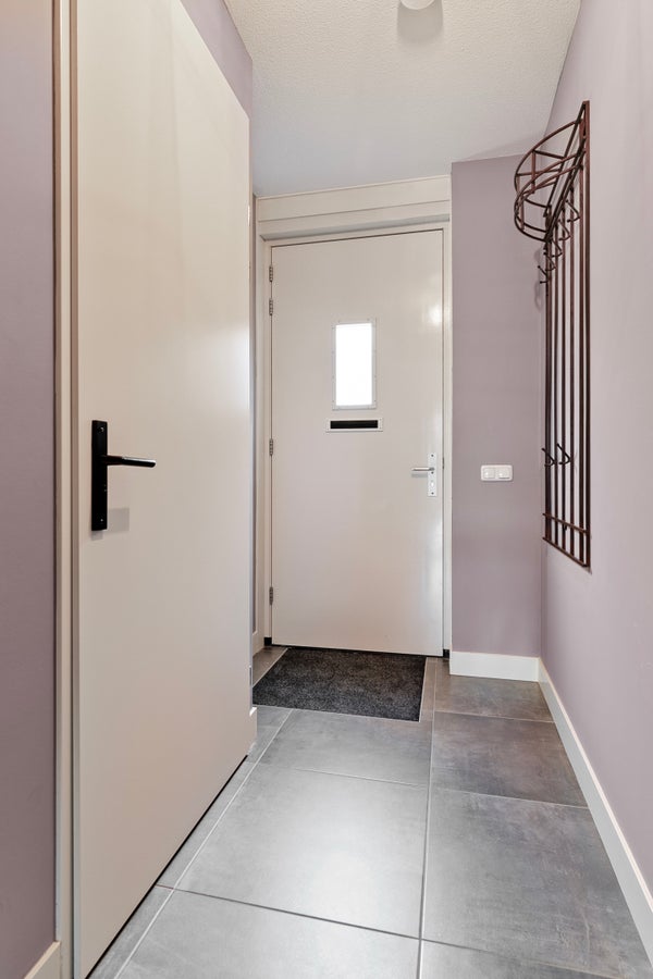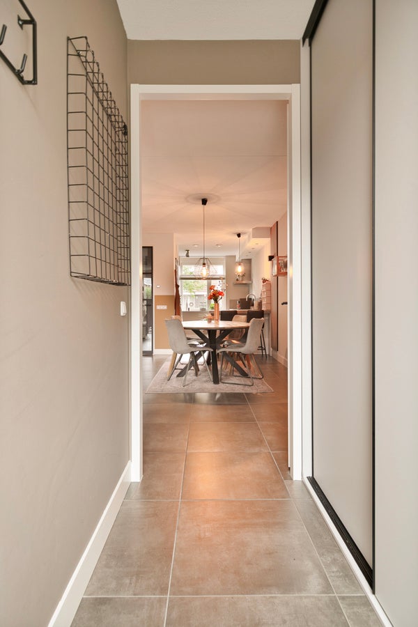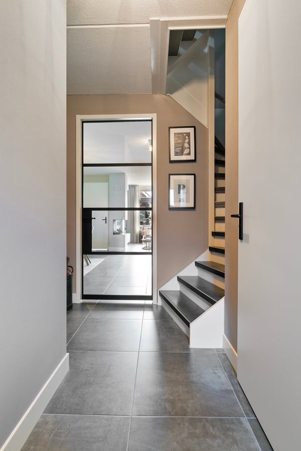 Je woont aan een park, dus er is geen auto- of fietsverkeer voor de deur. Via het voetpad loop je naar de voortuin en vervolgens naar de voordeur. De hal is een prachtige ruimte met een trendy woonkamerdeur, de trapopgang en meterkast. Aan de rechterzijde vind je de moderne toiletruimte, ingedeeld met een wandcloset en een fonteintje. De tegelvloer met vloerverwarming ligt niet alleen in de hal, maar ook in de woonkamer en het portaal naar de tuin.