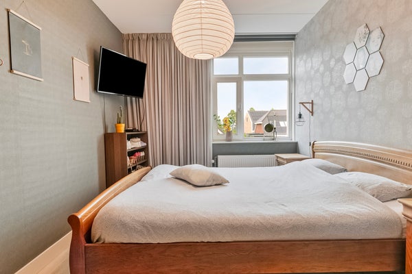 Vanaf de fraaie overloop zijn drie slaapkamers en de badkamer te bereiken. Aan de achterzijde bevinden zich twee slaapkamers, ingericht als ouderslaapkamer en als kinderslaapkamer. Aan de voorzijde bevindt zich de derde slaapkamer. In alle slaapkamers en op de overloop ligt laminaat en de muren zijn deels geschilderd, deels afgewerkt met behang. De moderne badkamer met grote wand- en vloertegels is ingedeeld met een inloopdouche, ligbad, wandcloset, een tweepersoons wastafelmeubel en een spiegelkast.