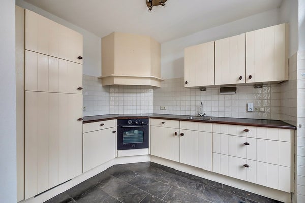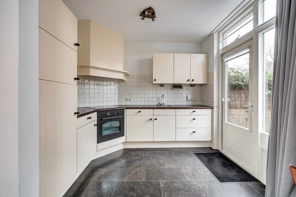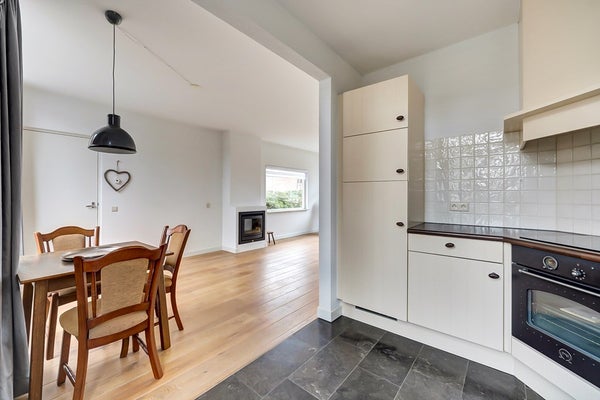 Aan de achterzijde van de woning bevindt zich de praktisch ingerichte keuken in hoekopstelling, voorzien van diverse inbouwapparatuur zoals een kookplaat, afzuigkap, ingebouwde oven, vaatwasser, en koelkast. Daarnaast is er voldoende werk- en kastruimte aanwezig. De donkere stenen vloer geeft de keuken een nette en moderne uitstraling. Vanuit de keuken heeft u directe toegang tot de achtertuin, wat zorgt voor een prettige verbinding tussen binnen en buiten.
