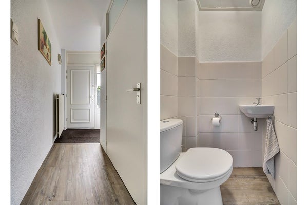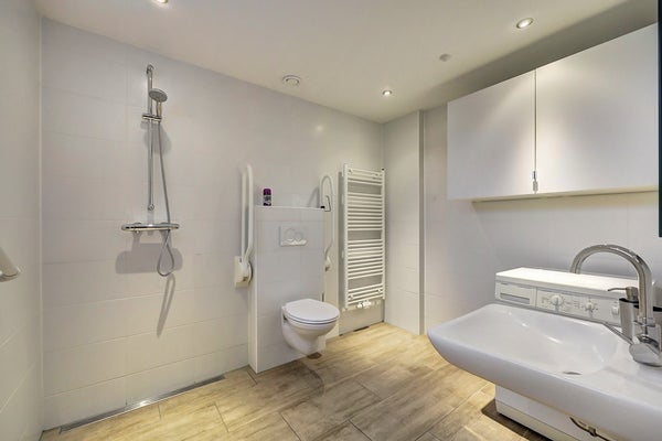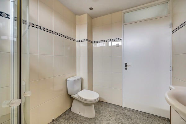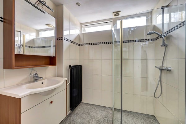 De badkamer is netjes en compleet uitgevoerd en voorzien van een douche, wastafelmeubel en toilet. Dankzij de lichte afwerking heeft de ruimte een frisse en verzorgde uitstraling.