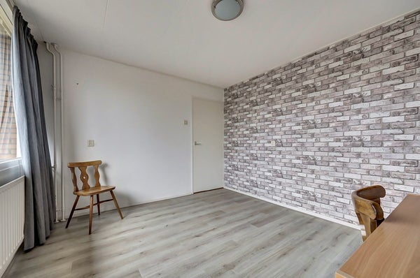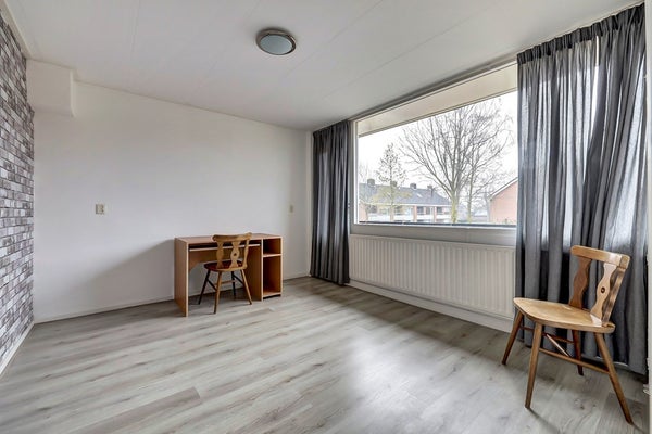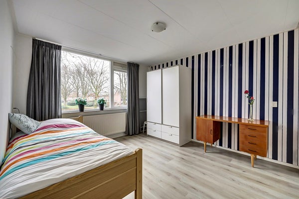 Op de eerste verdieping geeft de overloop toegang tot drie slaapkamers en de badkamer. De slaapkamers zijn stuk voor stuk goed van formaat en voorzien van prettig daglicht. Alle kamers zijn doorlopend (dus zonder dorpels) afgewerkt met een lichte laminaat vloer. De slaapkamer aan de voorzijde van de woning beschikt bovendien over toegang tot een balkon, wat zorgt voor extra buitenruimte op deze verdieping.