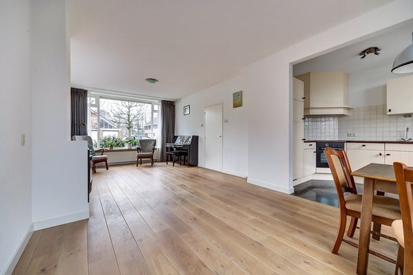 Via de entree komt u binnen in de hal met garderoberuimte, toiletruimte, ruime bergkast, trapopgang en toegang tot de woonkamer. De woonkamer is ruim en licht, met grote raampartijen aan de voorzijde die zorgen voor prettig daglicht. De eikenhouten vloer geeft de ruimte een warme uitstraling en de haard vormt een sfeervol middelpunt. Er is genoeg ruimte voor een comfortabele zithoek en een aparte eethoek. Vanuit de woonkamer bereikt u tevens een slaapkamer met aangrenzende badkamer, wat deze woning uitermate geschikt maakt voor gelijkvloers wonen, een gastenverblijf of een praktijkruimte aan huis. De slaapkamer en badkamer op de begane vloer zijn voorzien van vloerverwarming die met een eigen CV worden gevoed. Dit zorgt voor snel warm water in de badkamer en geen verlies voor de vloerverwarming.