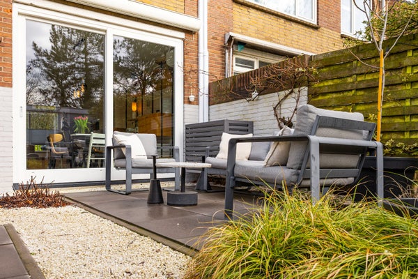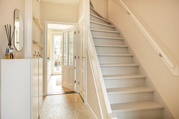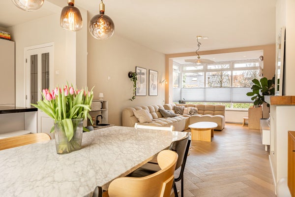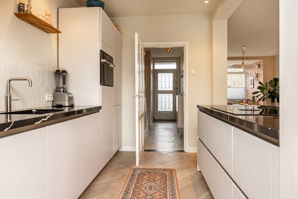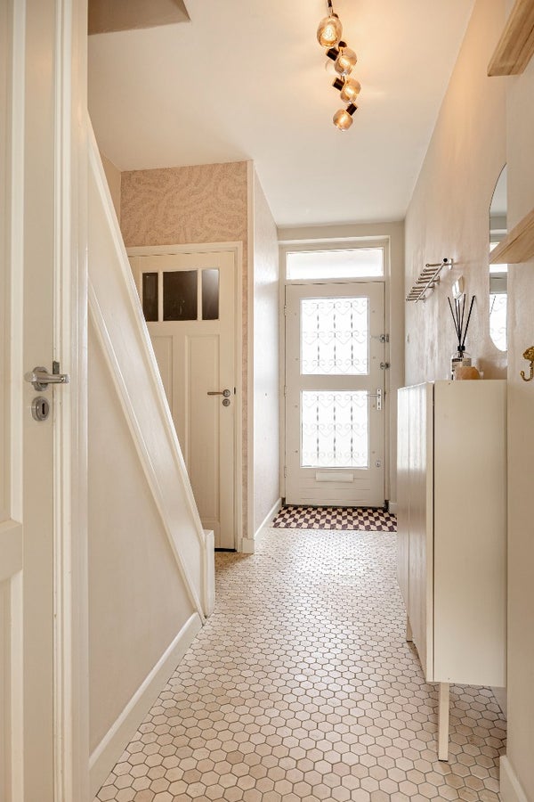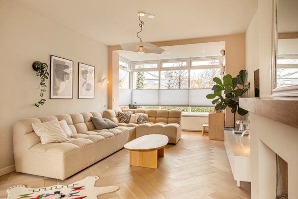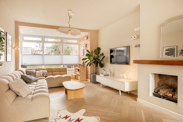Begane grond: overdekte entree, hal, deur naar kelder, toilet met wandcloset, fontein en raampje, trapopgang, openkeuken met keukeninrichting in lengteopstelling, kookeiland, inbouwapparatuur (o.a. Quooker) en deur naar de achtertuin, woonkamer met gashaard, airco (2024), erker en schuifpui naar de achtertuin.