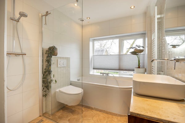 Eerste verdieping: overloop, trapopgang, badkamer met inloopdouche, wandcloset, ligbad en wastafelmeubel, slaapkamer aan de voorzijde met inloopkast, slaapkamer aan de achterzijde met wastafelmeubel en airco (2024), slaapkamer aan de achterzijde met airco (2024).