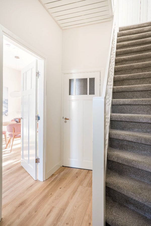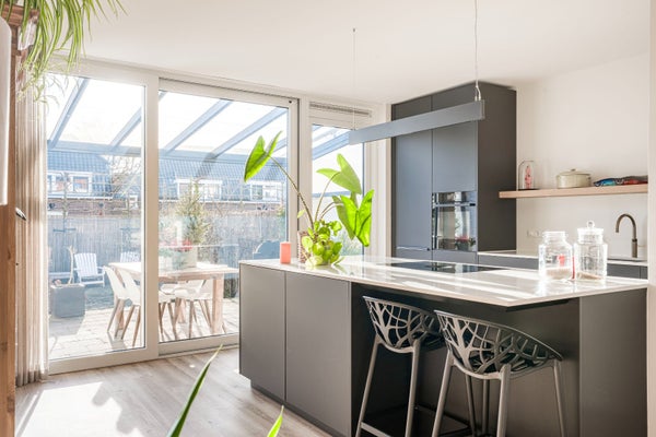 Begane grond: entree, gang, trapopgang, deur naar kelder, badkamer met fontein, wandcloset, wastafelmeubel en inloopdouche, lichte woonkamer met hoog plafond en erker, luxe keuken (2022) in uitbouw met kookeiland, keukeninrichting in lengteopstelling, inbouwapparatuur en aluminium schuifpui naar de veranda (2023).