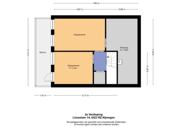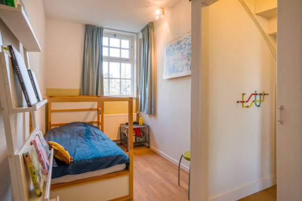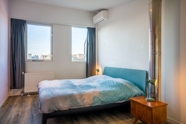 Tweede verdieping: bergruimte, slaapkamer aan de voorzijde met deur naar het dakterras, ruime slaapkamer met airco, aansluitend een bergruimte met inbouwkasten en opstelplaats installaties.