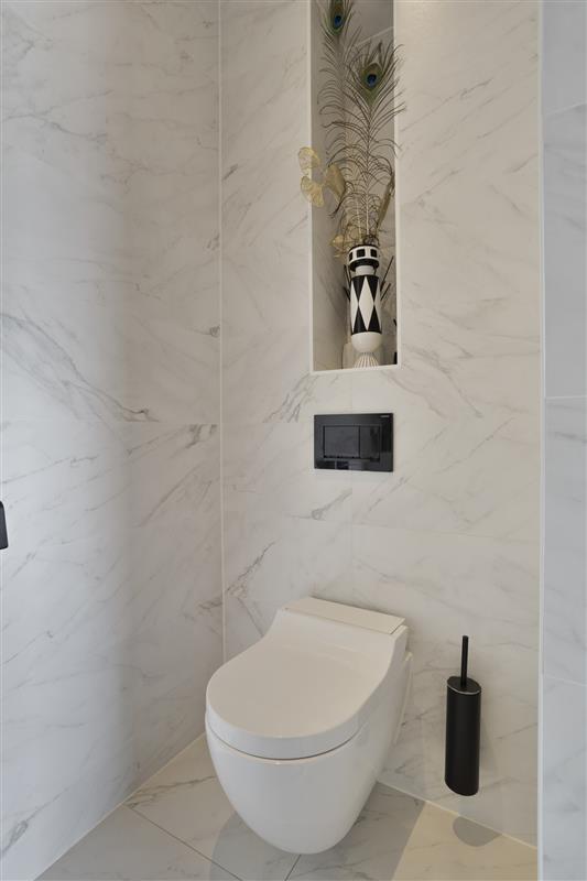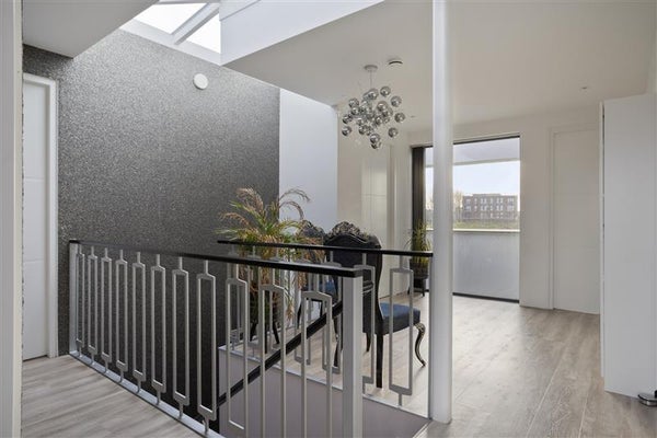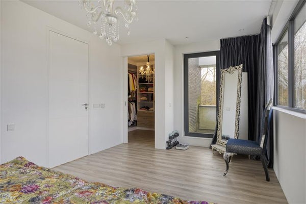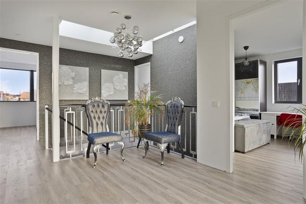 Via een mooie bordestrap kom je op de eerste verdieping direct uit op een lichte en ruime overloop. Deze overloop ligt centraal in het huis en vanuit hier bereik je alle ruimtes. De luxe badkamer is voorzien van een ligbad, dubbel wastafelmeubel en een royale inloopdouche, naast de badkamer is er een separate toilet. De ouder slaapkamer heeft een eigen inloopkast / garderobe en toegang tot een balkon. Daarnaast zijn er nog drie slaapkamers op deze verdieping.