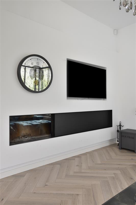 entree met ruime toilet met fonteintje, garderobehoek en meterkast, woonkamer van ruim 50 vierkante meter met open haard en vloerverwarming, vanuit de woonkamer kan je op verschillende plekken de rondom gelegen tuin in lopen. Op de vloer ligt een mooie in visgraat gelegde PVC vloer. De keuken is open met de woonkamer en voorzien van een kokend waterkraan en overige ingebouwde apparatuur. Naast de keuken is er toegang tot een handige bijkeuken met aansluiting voor de witgoedapparatuur. Via de bijkeuken kan je inpandig de garage bereiken.