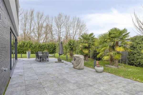 De tuin van de woning ligt rondom het huis. Vanuit de straat is er een ruime oprit met parkeerplaats voor meerdere auto's. Het grootste gedeelte van de tuin ligt naast de woning op het zonnige zuiden maar ook achter de woning op de westzijde is er veel ruimte, hier ligt ook het terras dat bereikbaar is vanuit de woonkamer en keuken. Dit terras is een heerlijke plek om de barbecue aan te steken. Zijn er nog wensen voor een zwembad? Er is plek genoeg om er een aan te leggen in je eigen tuin.