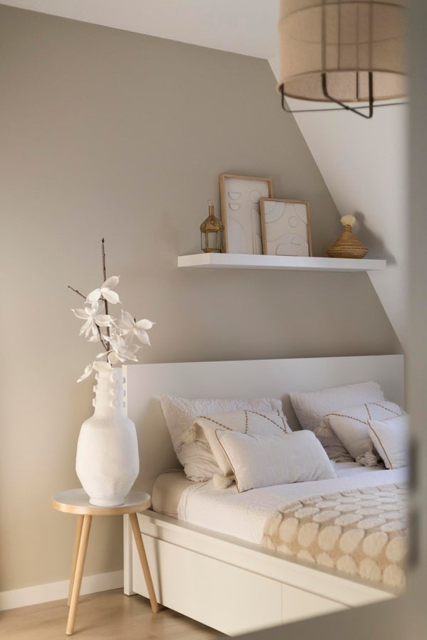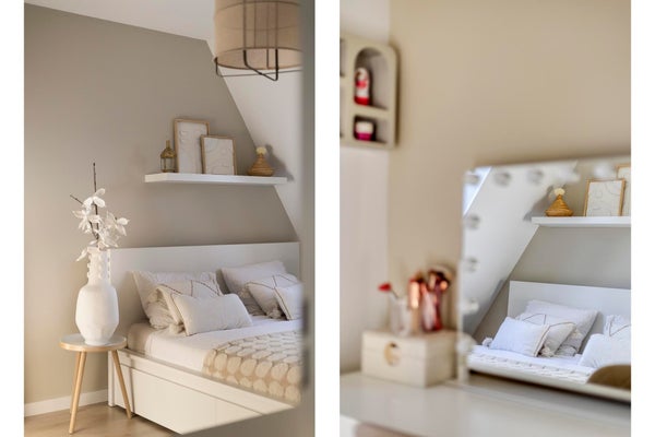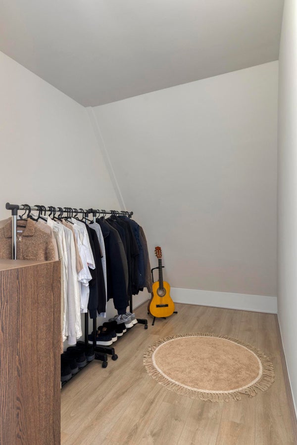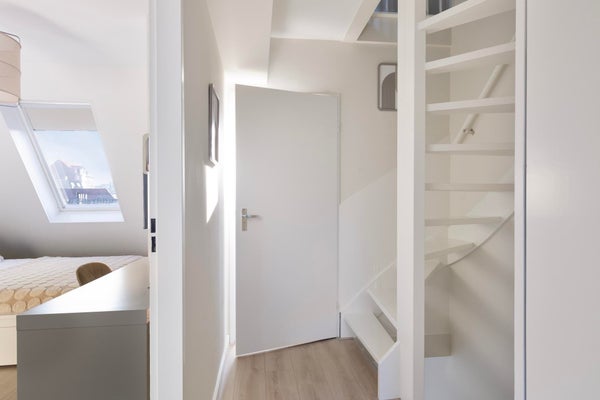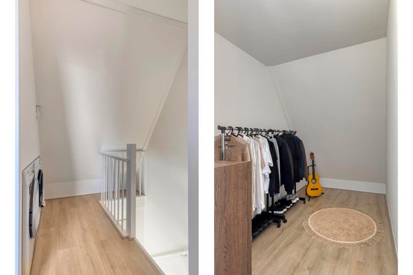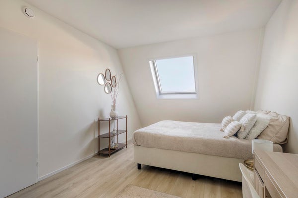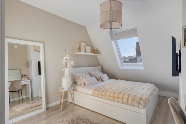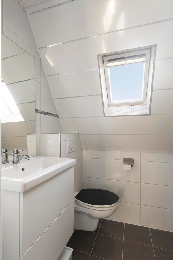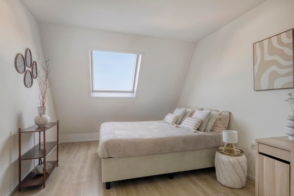 De zolderverdieping is ingericht als derde slaapkamer en vormt een volwaardige extra ruimte. Recent is hier een nieuw Velux dakraam geplaatst, wat zorgt voor extra licht en ventilatie. Dankzij de goede afmetingen is deze kamer uitstekend geschikt als master bedroom, logeerkamer of thuiswerkplek. Ook hier sluit de afwerking naadloos aan bij de rest van de woning.