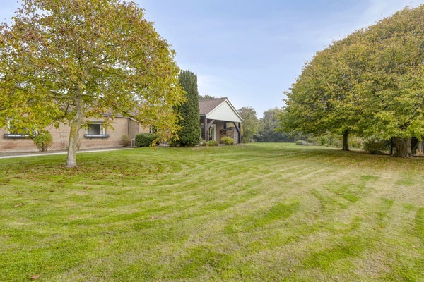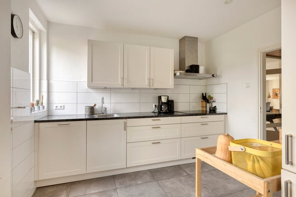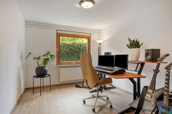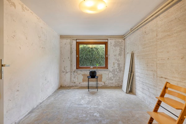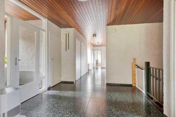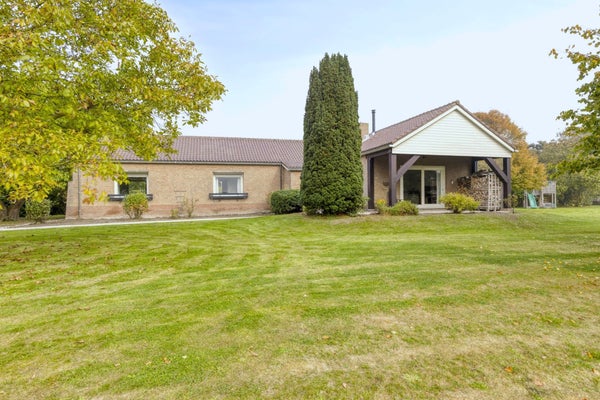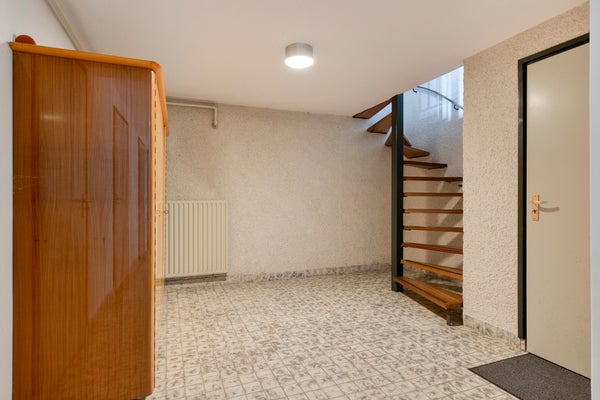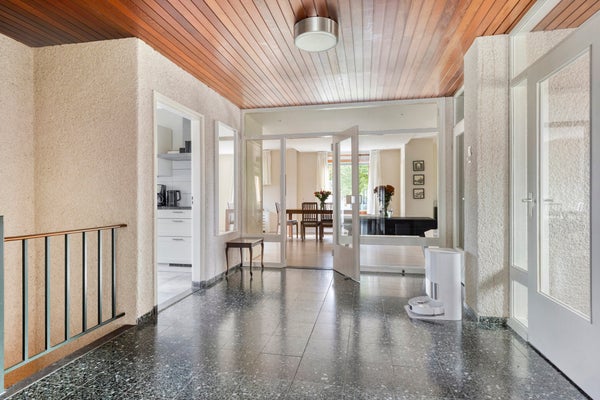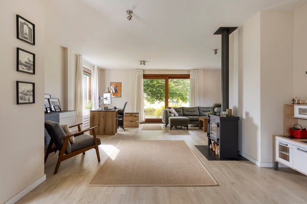 De hal leidt naar drie slaapkamers en een badkamer, die is uitgerust met een ligbad en dubbele wastafel. De lichte woonkamer met haard heeft toegang tot het overdekte terras. Het souterrain bevat twee extra slaapkamers, een tweede douche en meer opbergruimte. De tuin, van 1020 m², ligt op het zuiden en biedt voldoende ruimte om te ontspannen.