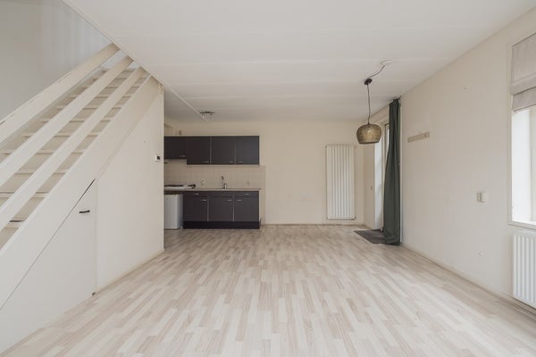Entree, een aangenaam lichte woonkamer met een keurige moderne open keuken. Er is bergruimte onder de trap en er is een toiletruimte. Aan de achterzijde bereikt u via de schuifpui de ruimte achter de woning. Een gedeelte van deze buitenruimte wordt aan de woning toebedeeld.