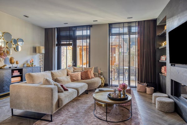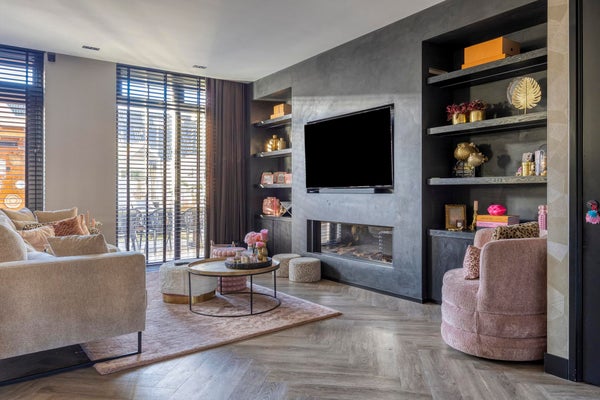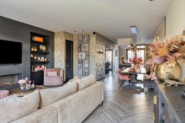 • Lichte woonkamer met visgraatvloer en ingebouwde haard
