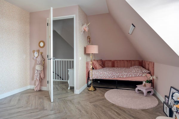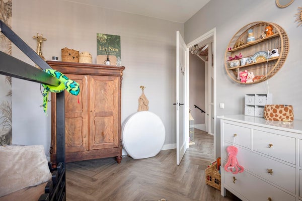 Op de eerste verdieping bevinden zich drie slaapkamers, allen grenzend aan de overloop. De kamers zijn licht en ruim opgezet en bieden voldoende plaats voor een bed, bureau en kastruimte. Dankzij de veelzijdige indeling zijn de kamers multi-inzetbaar en desgewenst te gebruiken als werk- of hobbykamer. Eén van de slaapkamers is voorzien van ingebouwde kasten. De visgraatvloer die doorloopt over deze verdieping zorgt voor een luxe uitstraling.