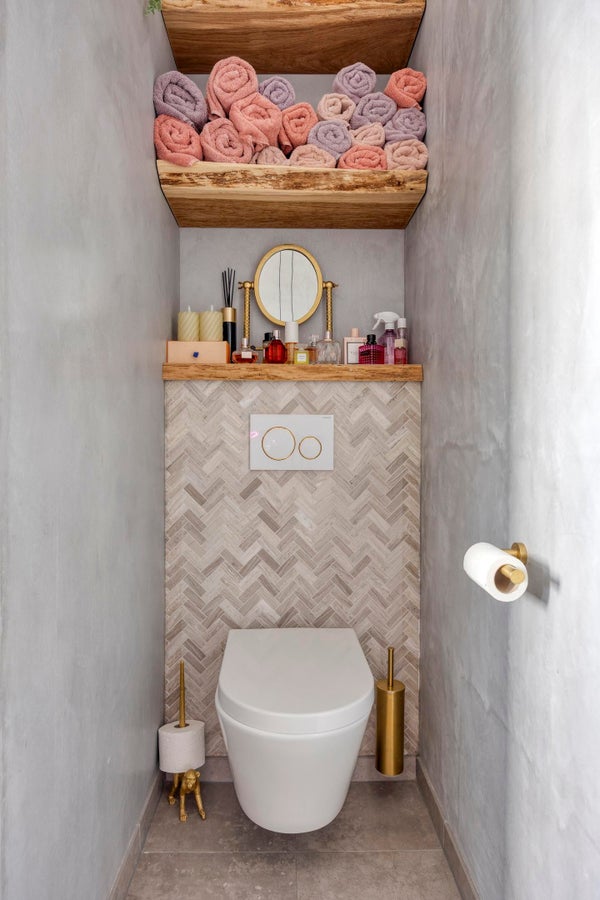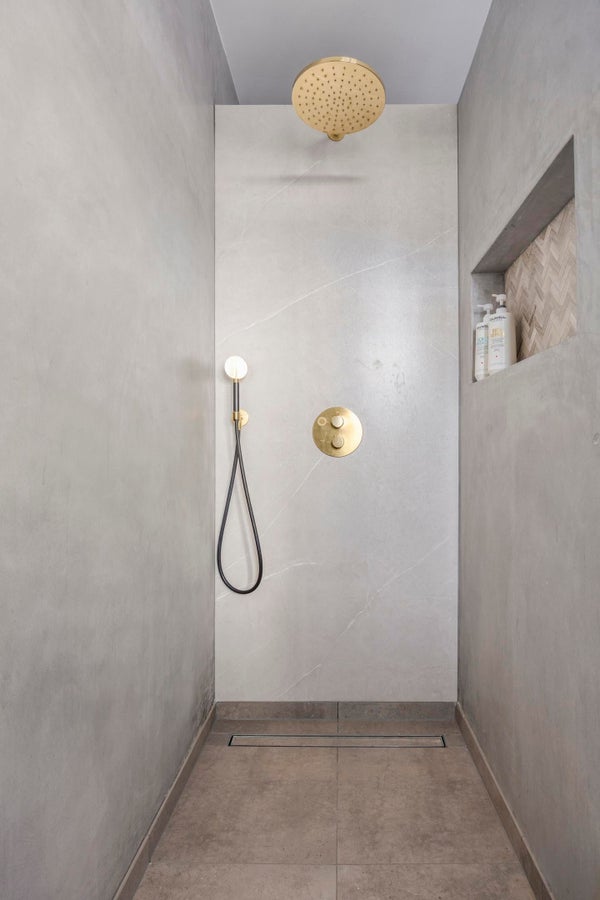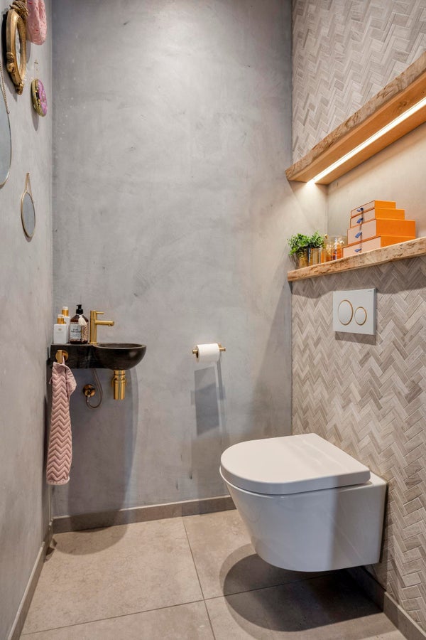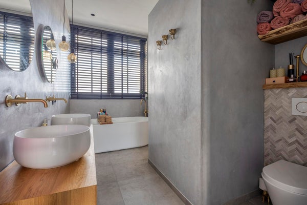 De nette en moderne badkamer grenst aan de overloop en is van alle gemakken voorzien. U beschikt hier over een inloopdouche, een ligbad, een zwevend toilet en een dubbele wastafel met spiegel. De tegelvloer en strakke afwerking geven de badkamer een frisse en eigentijdse uitstraling, waardoor dit een fijne plek is om de dag te beginnen of juist ontspannen af te sluiten.