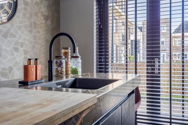 Aan de voorzijde van de woning bevindt zich de moderne en ruime keuken, die is ingericht met een langwerpig kookeiland. Dit eiland vormt het centrale punt van de ruimte en nodigt uit tot samen koken en genieten. De keuken is voorzien van een gasfornuis met pitcooking en met afzuigkap, een spoelbak en een vaatwasmachine. In de wandkast vindt u de koelkast en ovencombinatie, evenals volop opbergruimte in lades en kastjes. De strakke afwerking en doordachte indeling maken deze keuken tot een fijne en praktische plek.