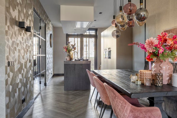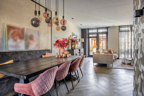 De woonkamer vormt het kloppend hart van de begane grond en is dankzij de open indeling heerlijk ruim en licht. Hier is meer dan genoeg plek voor een comfortabele zithoek en een royale eethoek. De grote pui met openslaande deuren aan de achterzijde zorgt voor een overvloed aan daglicht en biedt een directe verbinding met de tuin. De visgraat laminaatvloer geeft de ruimte een stijlvolle uitstraling, terwijl de tv-wand met ingebouwde haard een echte eyecatcher is en zorgt voor extra sfeer en warmte.