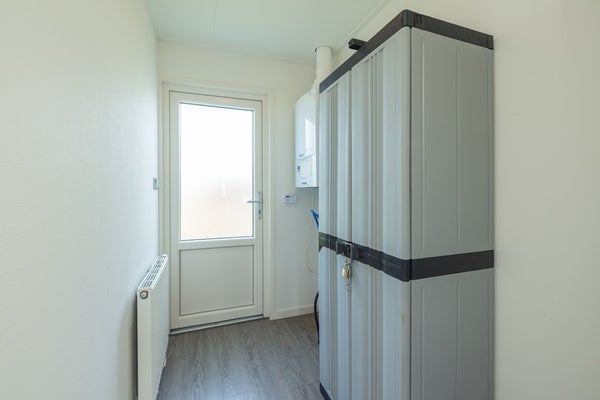 Entree, via de hal is de vernieuwde badkamer bereikbaar met een douche, een wandcloset, een wastafelmeubel, ingebouwde verlichting en een handdoekradiator. De (ouder) slaapkamer is voorzien van een kastenwand met daarin de opstelling van de stoppenkast. De tweede slaapkamer is voorzien van drie ingebouwde bedden en biedt daarmee ook aan de grotere gezinnen genoeg ruimte. Er is een aparte inpandige ruimte met de opstelling van de CV-ketel en een deur naar buiten. De woonkamer is aangenaam licht door de grote erker en is voorzien van ingebouwde verlichting en openslaande deuren naar het op het zuiden gelegen zonneterras. De open keuken is in lichte kleuren uitgevoerd en is voorzien van diverse inbouwapparatuur zoals een gaskookplaat, een afzuigkap, een koelkast, een aparte vriezer, een combimagnetron, een vaatwasser en een kookeiland.