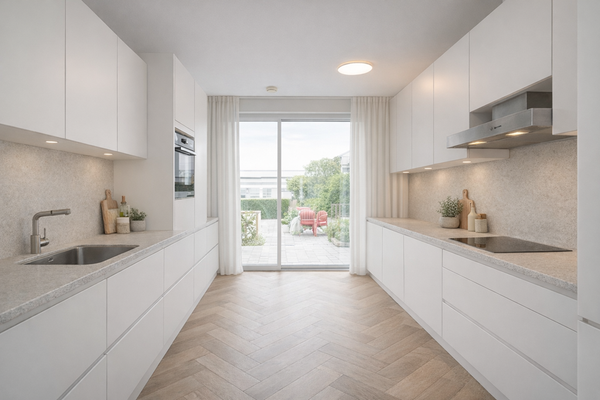 Via de entree kom je in de ruime hal met garderobe, meterkast en modern toilet. De woonkamer met trapkast is licht en uitnodigend, met openslaande deuren naar de tuin. De open keuken aan de voorzijde is voorzien van een plafondhoog raam, waardoor er de hele dag prettig daglicht binnenvalt. De gehele begane grond is voorzien van vloerverwarming en plavuizen. Comfortabel én praktisch.