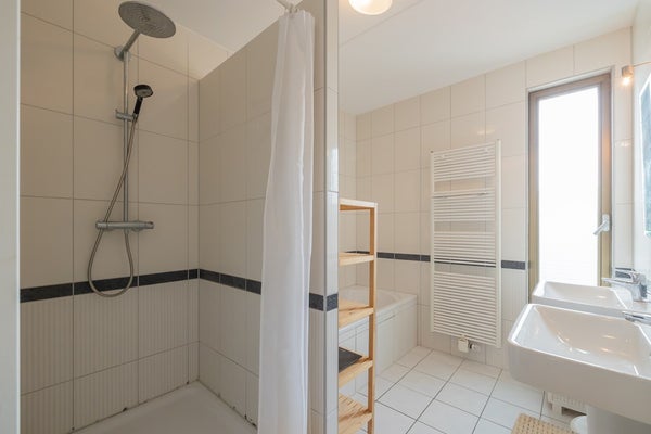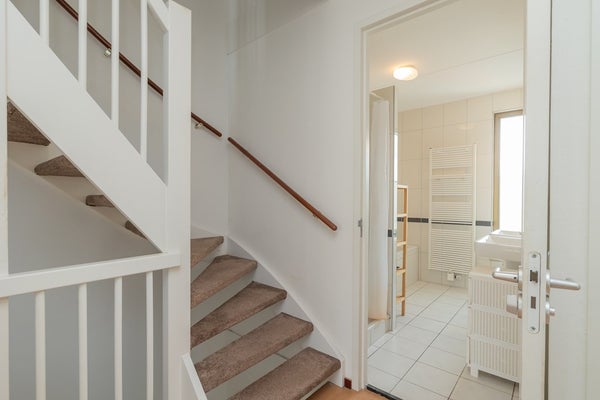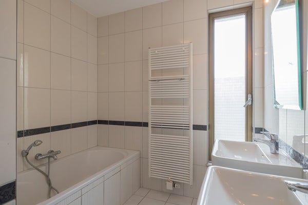 Op de eerste verdieping zijn drie goed bemeten slaapkamers met laminaatvloer. De ruime badkamer is uitgerust met een douche, ligbad, dubbele wastafel en een raam voor natuurlijke ventilatie. Op de overloop vind je een separaat tweede toilet en een handige bergkast.