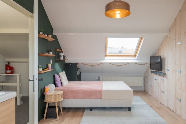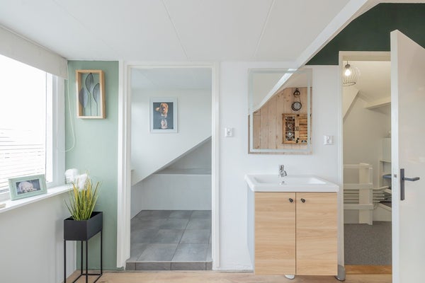 De zolderverdieping biedt een sfeervolle slaapkamer met dakraam en dakkapel, wastafel en een derde badkamer met ligbad en toilet. Slimme inbouwkasten en bergruimte zorgen dat alles netjes is weggewerkt.