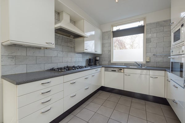 Entree, hal met de garderobe, de meterkast en de toiletruimte met een vrij hangend toilet. De aangenaam lichte en op de tuin gerichte woonkamer heeft een kast onder de trap en een schuifpui over de gehele breedte van de woning. De keuken is in lichte kleur uitgevoerd, is gelegen aan de voorzijde en is voorzien van diverse inbouwapparatuur zoals een 5-pits gaskookplaat met een wokbrander, een afzuigkap, een oven, een vaatwasser en een ingebouwde koel-/ vries combinatie.