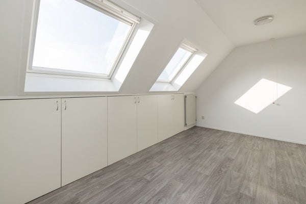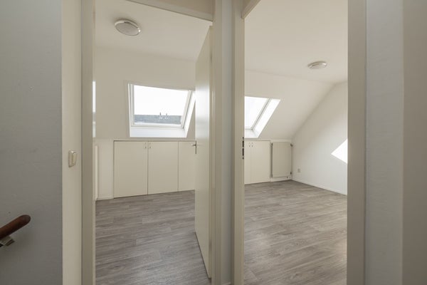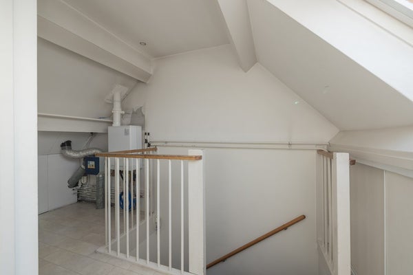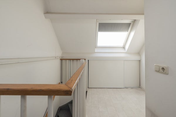 Op de overloop bevindt zich de CV-ketel, de ventilatie-unit, een dakraam en ingebouwde bergruimte met schuifpanelen. Via de overloop kan de bergruimte in de nok van de woning worden bereikt. De zolderkamer beschikt over een dakkapel, een dakraam en veel bergruimte. Vanuit de zolderkamer heeft u een weids uitzicht over het BAVO-terrein.