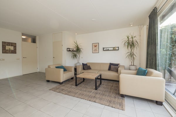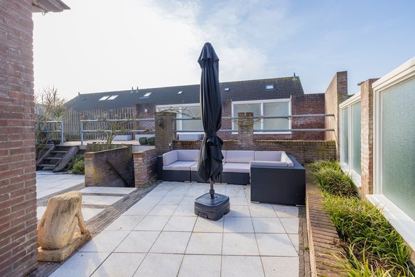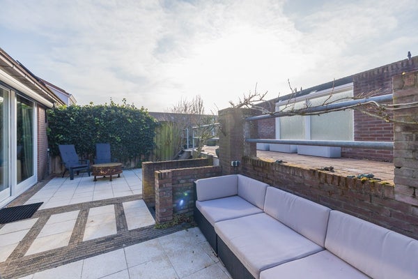 De achtertuin is zowel via een deur aan de zijkant als een deur aan de achterzijde bereikbaar. De zonligging van deze tuin is echt optimaal. Er is een elektrisch bedienbaar zonnescherm aanwezig voor verkoeling op de warme zomerdagen. De twee ruime bergingen liggen iets lager en zijn met een kleine trap of via de achteringang te bereiken.