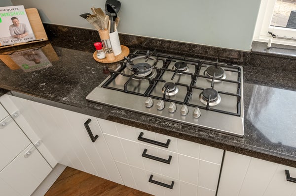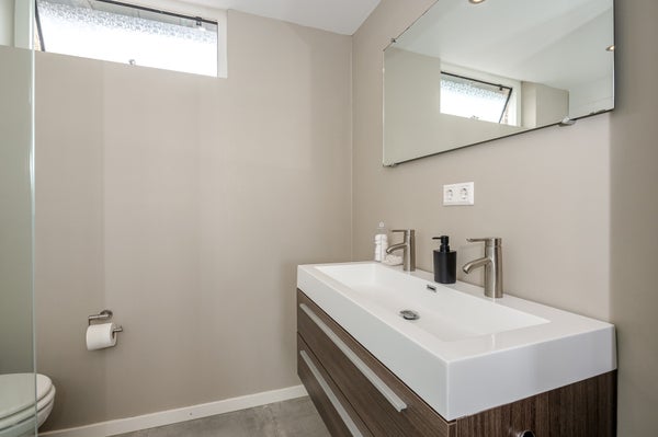 Bij binnenkomst staat u in een ruime hal met modern toilet en toegang tot de tuingerichte woonkamer, die onder andere over vloerverwarming en een PVC-vloer beschikt. De moderne keuken heeft een zwart stenen aanrechtblad en diverse apparaten.