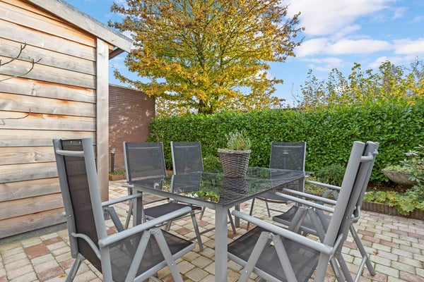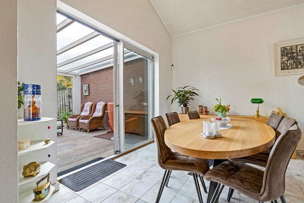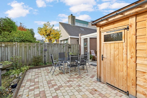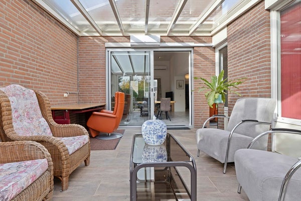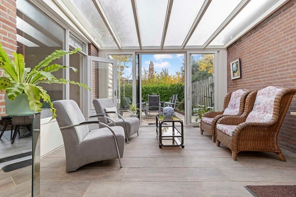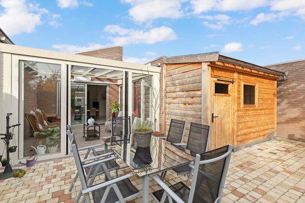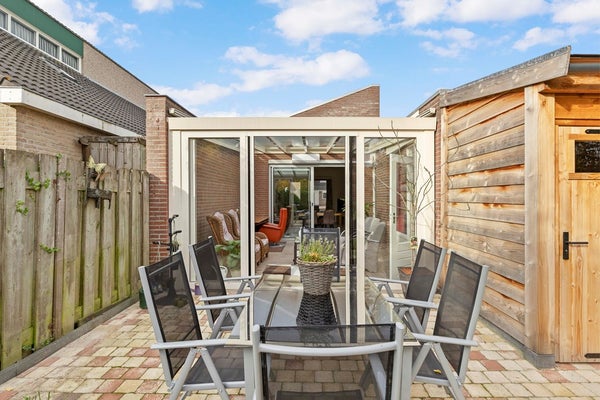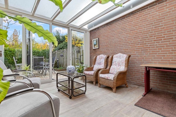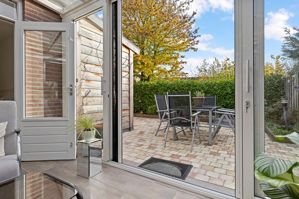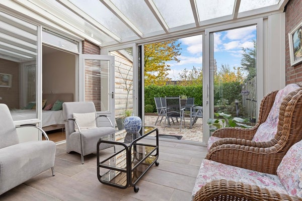 De tuinkamer is een heerlijke plek om te genieten—of het nu lente, zomer, herfst of winter is. De airco houdt de temperatuur altijd fijn, en met de elektrisch bedienbare zonneluifel creëert u in een handomdraai een knusse, beschutte plek. Via de schuifpui loopt u zo de verzorgde achtertuin in, met een sfeervol terras, groene borders en een vernieuwde houten berging (2024) waar u alle ruimte heeft voor hobby’s of opslag.