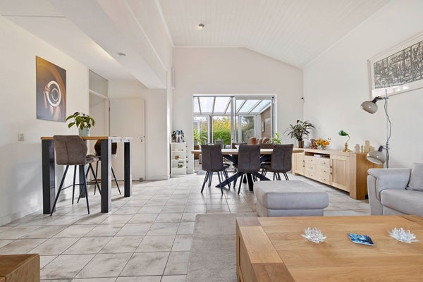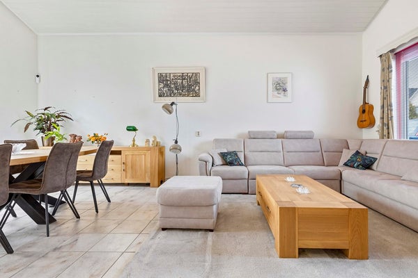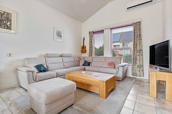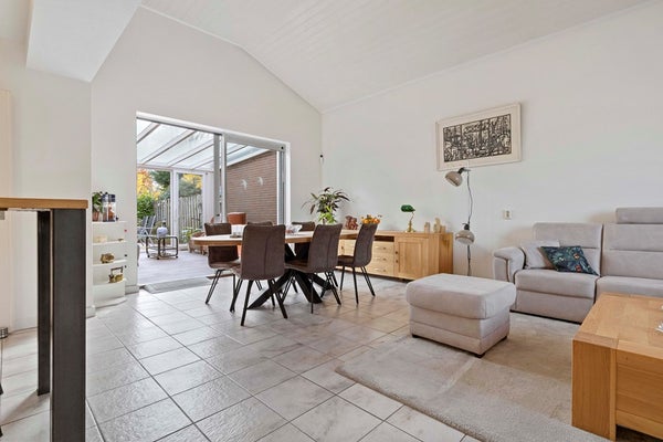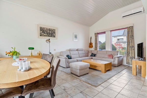 Hier wordt u meteen blij van de hoge plafonds, de heerlijke lichtinval en de open sfeer. De schuifpui naar de tuinkamer maakt het geheel extra ruimtelijk, alsof binnen en buiten één geheel vormen. Dankzij de airco blijft het binnenklimaat altijd precies goed. De keuken sluit er gezellig op aan en is compleet uitgerust, zodat koken en tafelen een plezierige ervaring worden.