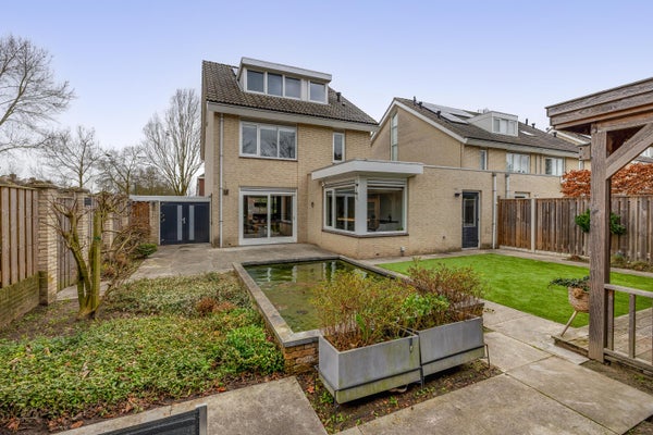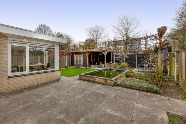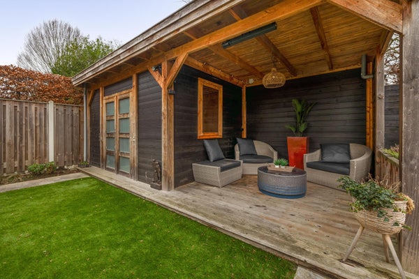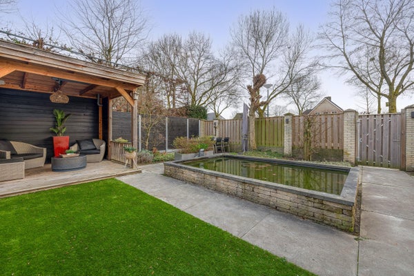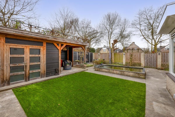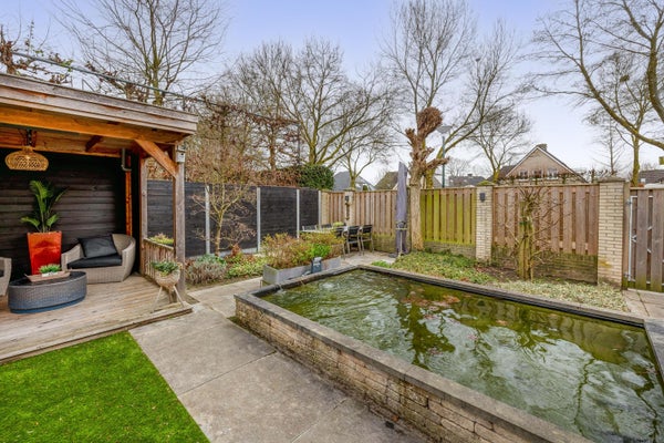 De diepe en modern aangelegde achtertuin biedt volop privacy en rust. De tuin is fraai aangelegd met meerdere terrassen, een vijver, buitenkraan, verlichting, een kunstgrasgedeelte, een achterom via een houten poort en diverse groene accenten. Achterin de tuin bevindt zich een hedendaagse blokhut met een gezellig zitje onder de overkapping: een heerlijke plek om tot in de avond te genieten met een fijne blik op de tuin.