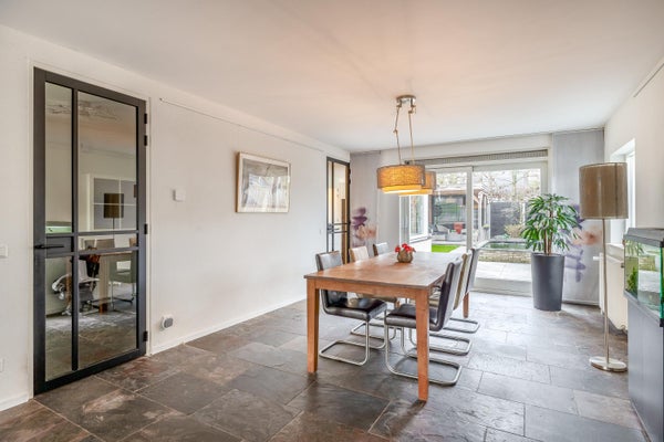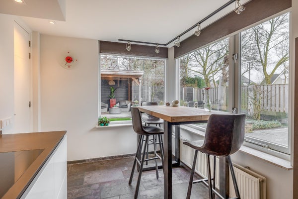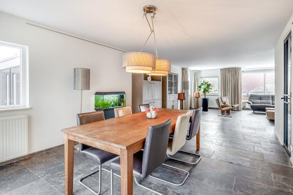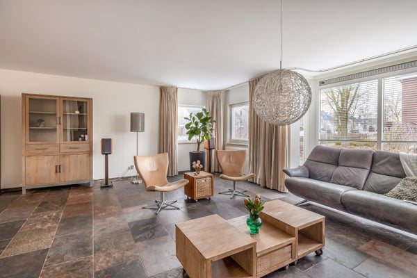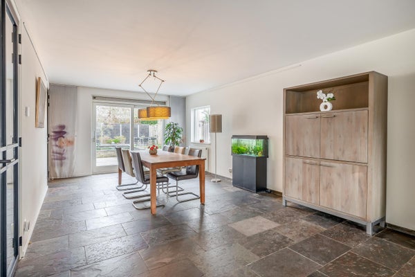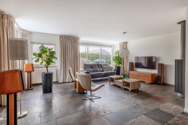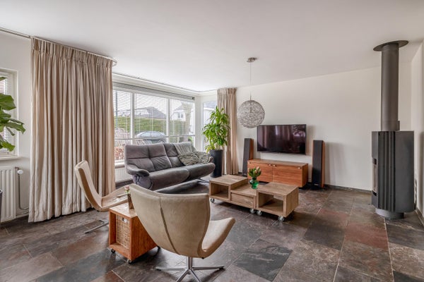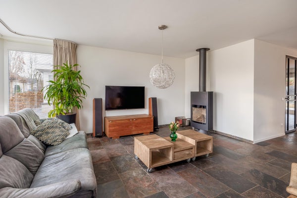 De zeer royale living vormt het hart van het huis en valt direct op door de prettige lichtinval en de fijne indeling. Grote raampartijen en een schuifpui naar de tuin zorgen voor een mooie verbinding met buiten. Tevens is de living voorzien van een groot erkerraam, een sfeervolle houtkachel en een leistenen vloer met vloerverwarming.