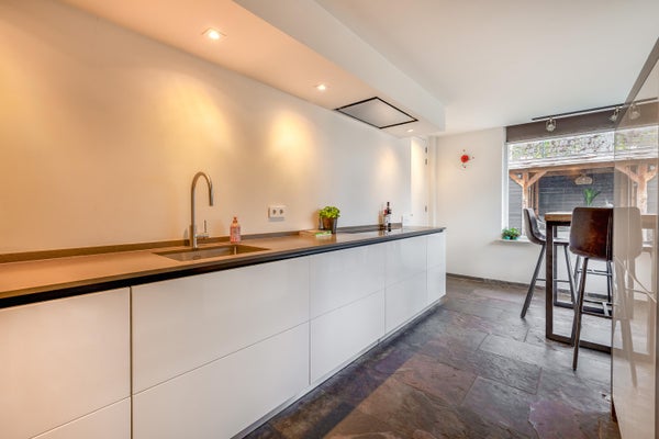 Aan de achterzijde bevindt zich de ruime en moderne leefkeuken, uitgevoerd in een strak en tijdloos design met een gezoet natuurstenen blad. Voorzien van diverse inbouwapparatuur zoals een inductie kookplaat, afzuiging, combi-magnetron, stoomoven, grote koelkast en vaatwasser. De keuken biedt ruimte aan een eettafel en geeft een mooi uitzicht op de tuin.