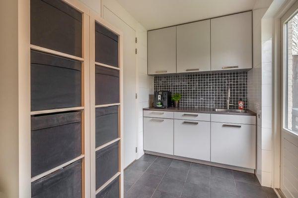 Aansluitend is er een praktische bijkeuken met daarin een 2e keukenblok voorzien van een spoelbak, waterkraan en Quooker. De bijkeuken is ideaal voor handige bergruimte en geeft toegang tot de tuin, alsmede de inpandige garage. Deze garage biedt parkeerruimte voor 1 auto en beschikt over openslaande deuren naar de oprit aan de voorzijde, wat het gebruiksgemak vergroot. Naast de woning is bovendien een extra berging aanwezig voor bijvoorbeeld fietsen, met openslaande deuren naar de achtertuin.