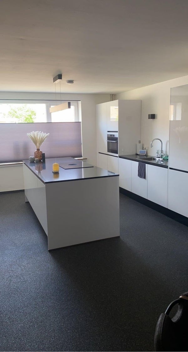 opEn keuken met schitterende , nieuwe aanbouwkeuken voorzien van diverse apparatuur: kookeiland,