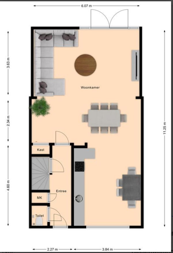 Woonkamer (11.25mx6.70m) met grindvloer.