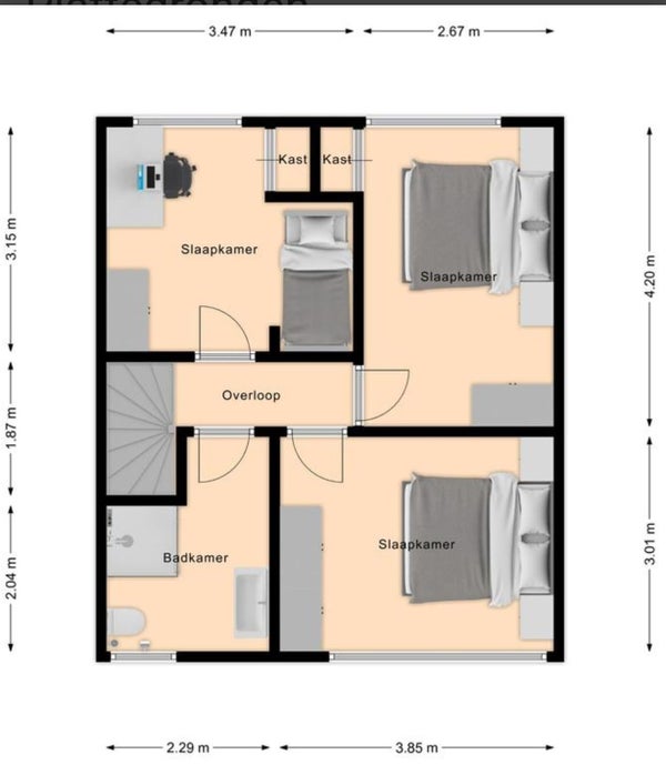 - De tussenwoning heeft een woonoppervlakte van 114 m² en beschikt over 4 kamers, waarvan 3 slaapkamers;