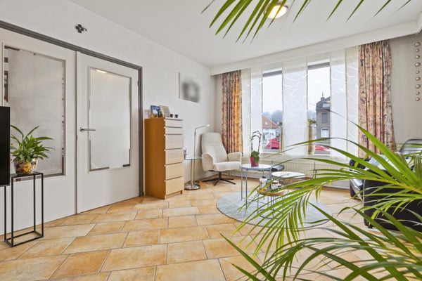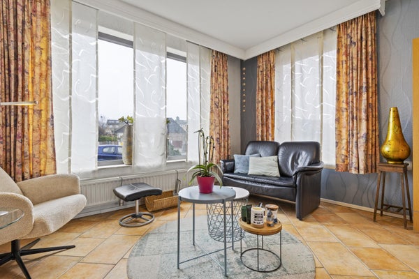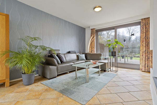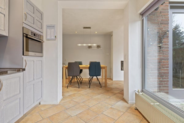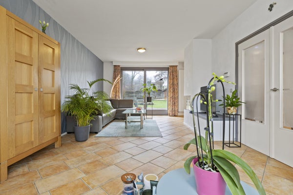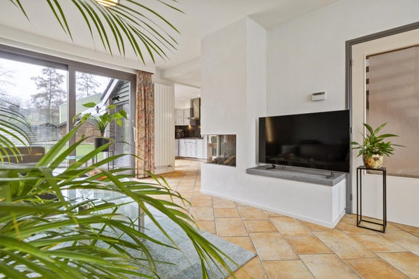 De openslaande deuren leiden naar de ruime woon-/eetkamer: een heerlijke leefruimte met veel lichtinval en een sfeervolle gashaard als warm middelpunt. Via de schuifpui loop je zo de achtertuin in, waardoor binnen en buiten naadloos in elkaar overlopen.