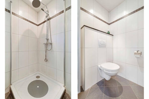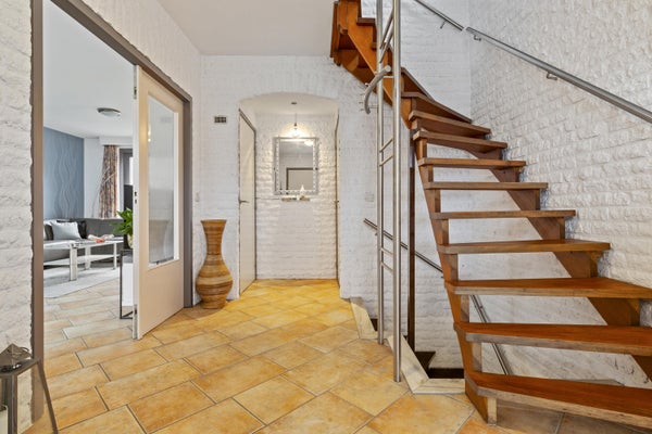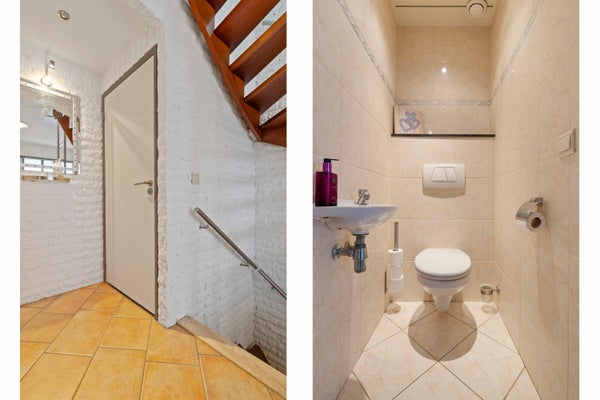 Je komt binnen in een royale, lichte entree die direct een prettige indruk geeft. Vanuit hier bereik je het souterrain, de eerste verdieping, de meterkast en het modern betegelde toilet met hangcloset en fonteintje.