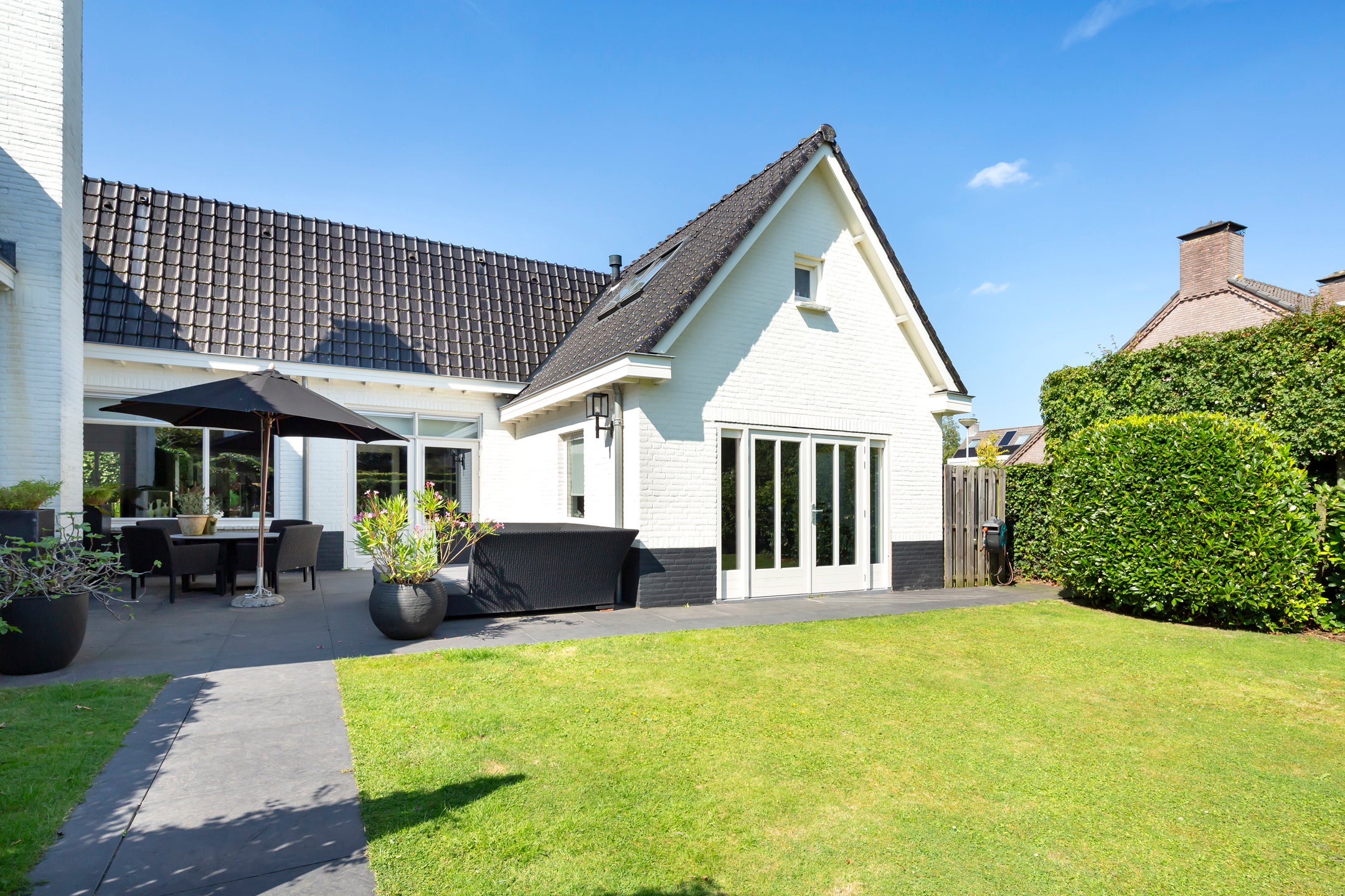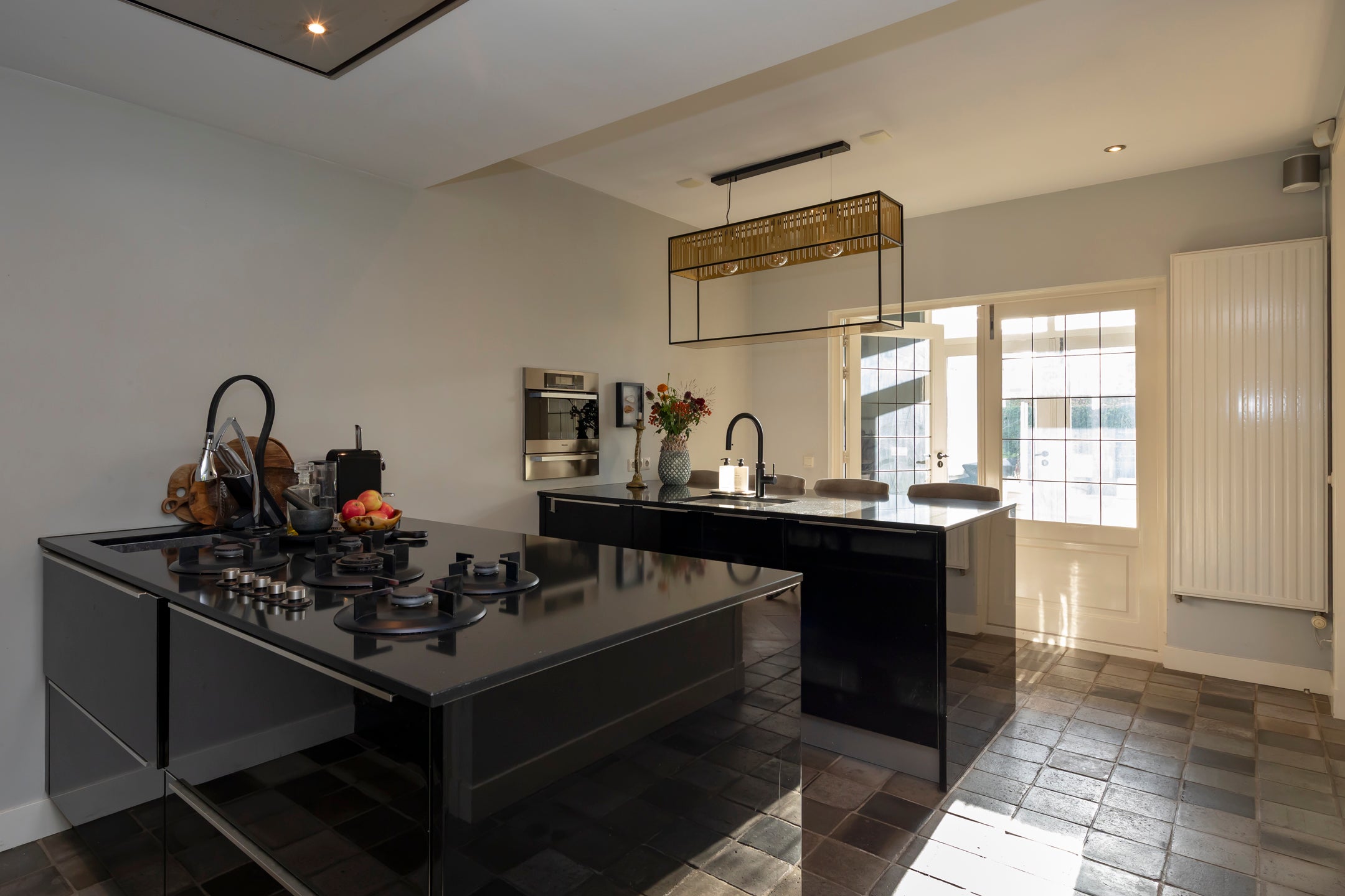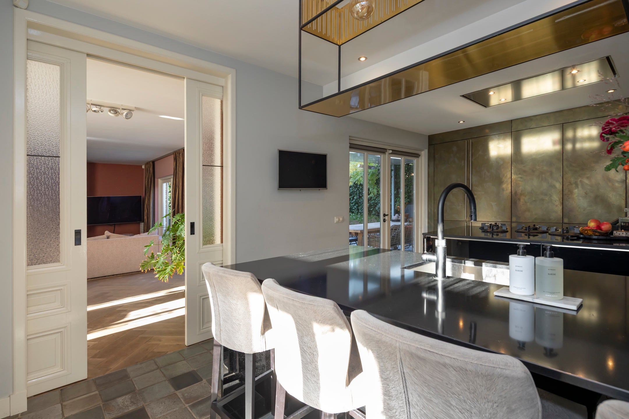 De sfeervolle woonkamer heeft openslaande deuren naar de patiotuin, terwijl de eetkamer met gashaard aansluit via prachtige en suite deuren. De multifunctionele speel- of werkkamer aan de voorkant kijkt uit op de tuin. De keuken is luxe en uitnodigend, perfect voor gezellige avonden.
