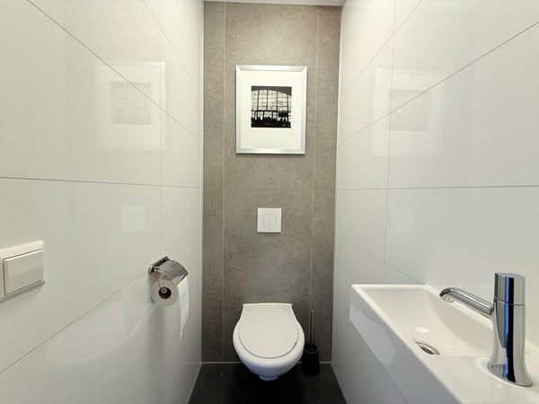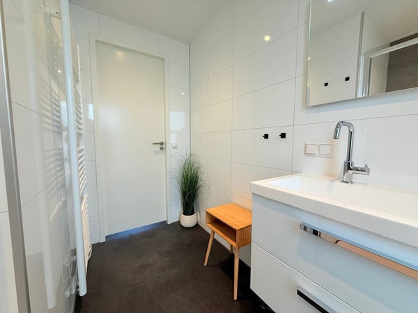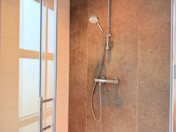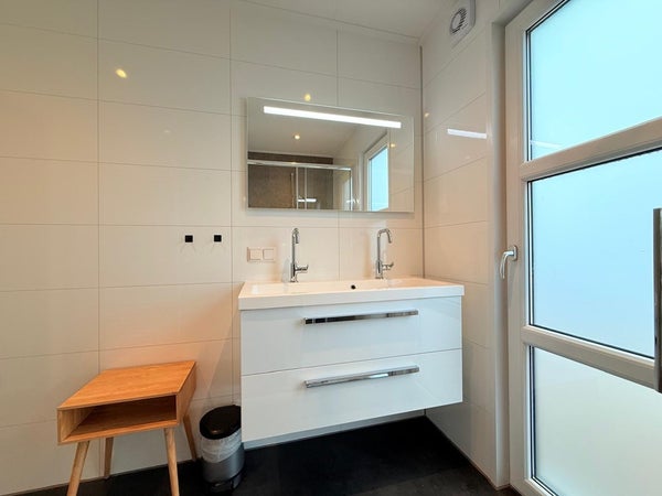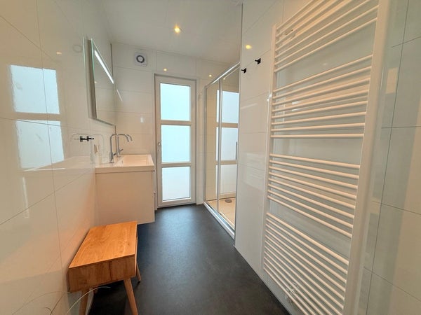 De royale badkamer is luxe uitgevoerd en beschikt over een ruime inloopdouche, een dubbele wastafel met meubel en spiegel, mechanische ventilatie en een designradiator. Dankzij het draai-kiepraam is ook hier natuurlijke ventilatie mogelijk. Daarnaast is er een aparte toiletruimte aanwezig, wat extra comfort biedt.