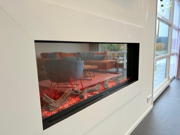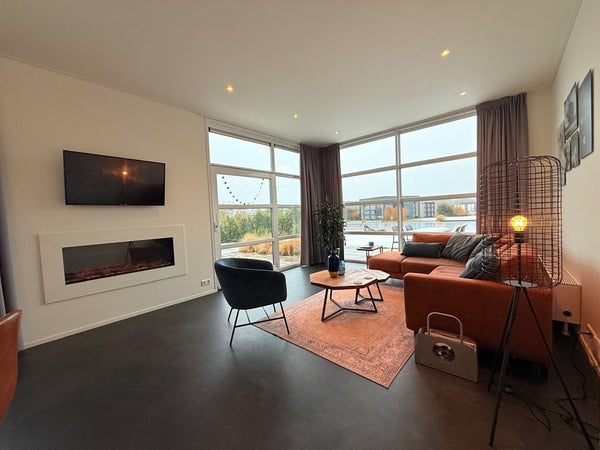 De royale woonkamer vormt het warme en sfeervolle hart van de woning. Grote raampartijen en het extra verhoogde plafond zorgen voor een indrukwekkend ruimtelijk gevoel en laten het daglicht rijkelijk binnenstromen. Vanuit de woonkamer geniet u van een prachtig uitzicht over de tuin en de aangrenzende vijver. De ingebouwde elektrische haard zorgt voor extra sfeer en comfort, terwijl de schuifpui een directe verbinding vormt met het betegelde terras en de tuin.