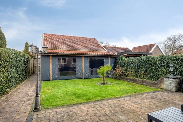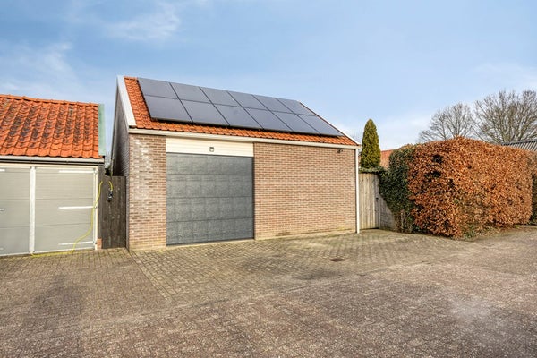 De achtertuin, gelegen op het zuidoosten, is o.a. voorzien van een terras, een overdekt terras, een achterom en een vrijstaande garage met zolder.