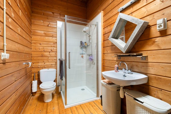 De badkamer is comfortabel ingericht met een dubbele stopcontact, extra stopcontact, een thermostatische kraan, toilet, ruime inloopdouche en een wasbak. Hier kunt u zorgeloos ontspannen in een praktische en moderne ruimte.