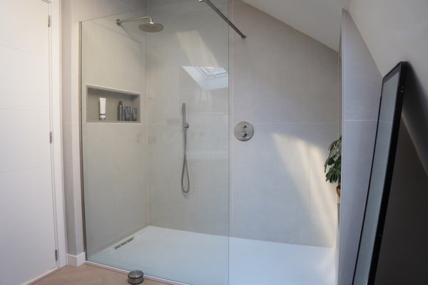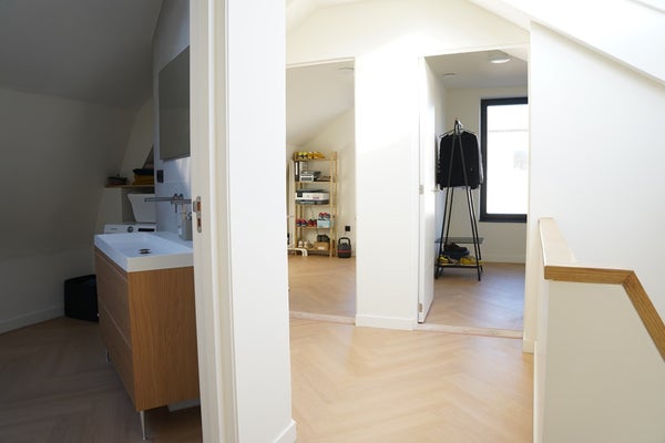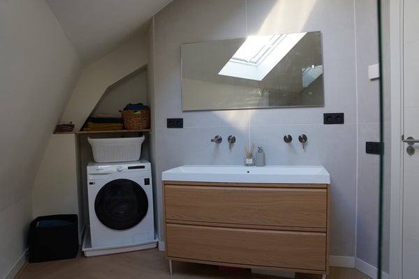 De badkamer is luxe en compleet uitgevoerd met een inloop- regendouche, dubbel wastafelmeubel, verwarmde spiegel en een Velux dakraam. Ook is hier een wasmachine aansluiting te vinden.