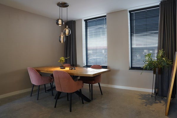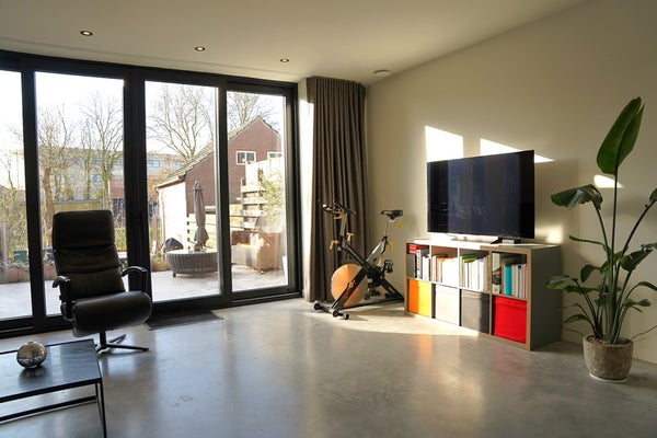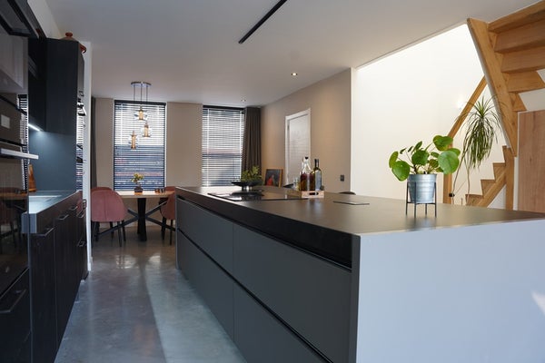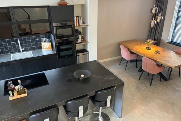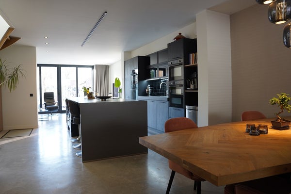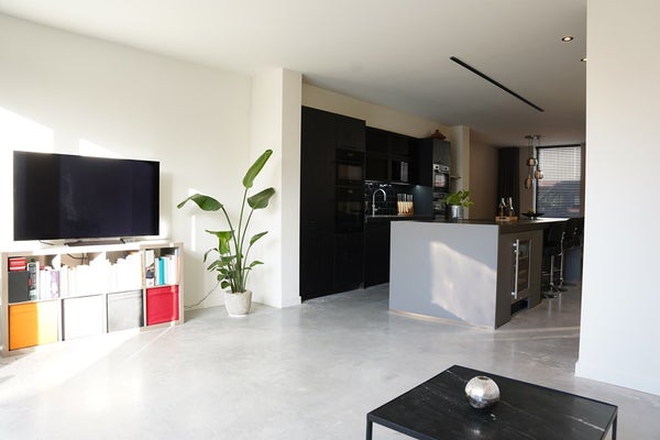 De betonvloer en strakke afwerking geven een eigentijdse uitstraling.