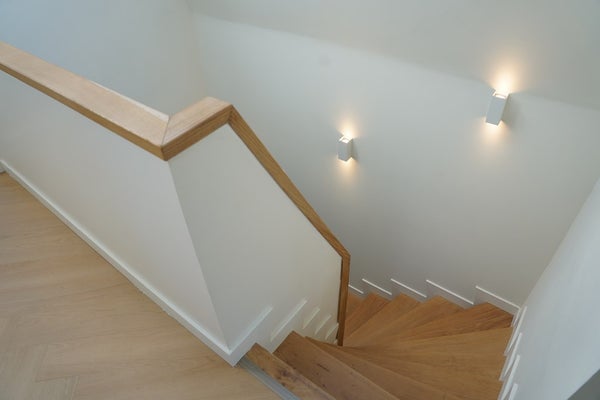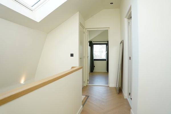 Via de stijlvolle trap kom je op de verdieping met visgraat pvc en overloop met prachtig daglicht dankzij drie Velux dakramen.