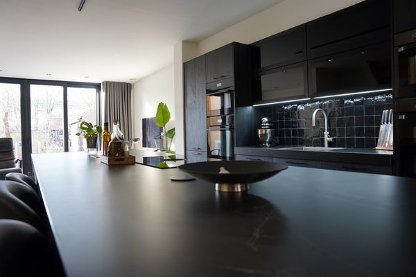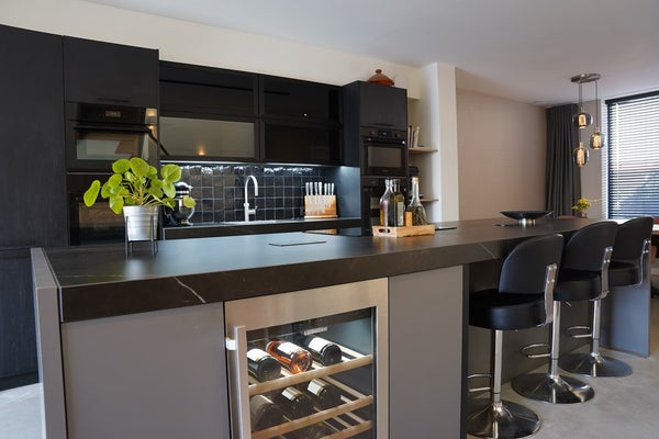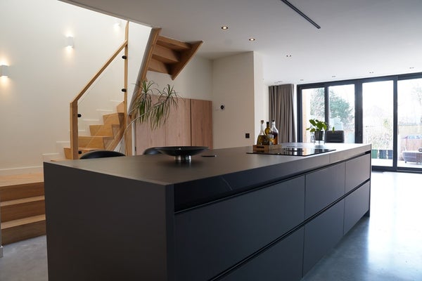 De open woonruimte is licht en ruim, met in het midden een luxe eilandkeuken als blikvanger in het hart van het huis.